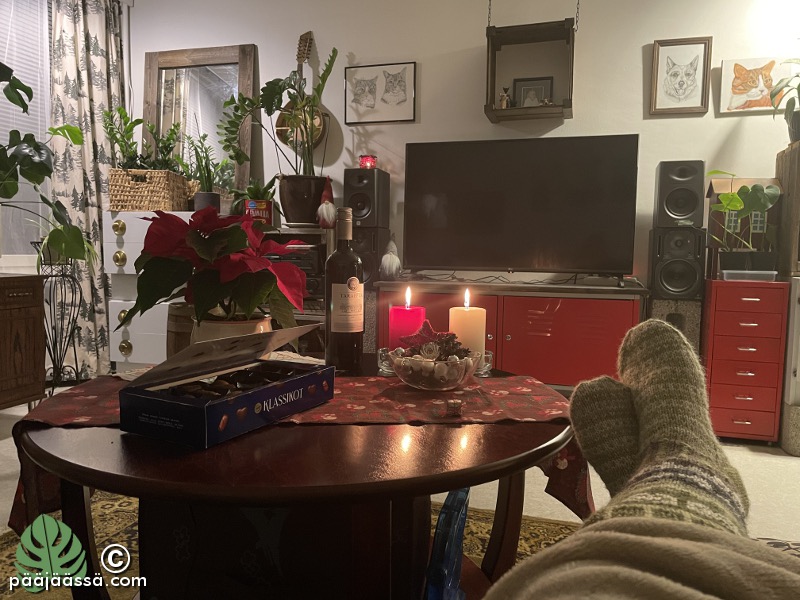 Edellä mainittu asia koskee erityisesti vaatekaappiani. Tai minullahan on useita vaatekaappeja ja vaatekomero. Huoneeksi sitä ei voi kutsua, vaikka mahdunkin sinne sisälle. Sinne ei kuitenkaan mahdu esimerkiksi penkki samanaikaisesti kun vaihtaisin vaatteita. Viimeeksi tuli etsittyä suoria housuja, jotka olisin halunnut laittaa jalkaan paikallisbaarin pikkujouluihin. Löysin kyllä kolmet suorat housut, joista mitkään eivät mahtuneet jalkaan. En edes muistanut, että minulla olisi ollut vielä muutamat eri paikassa, jotka sitten olisivatkin mahtuneet jalkaan. Onneksi en ostanut uusia housuja, vaan tyydyin laittamaan hameen iltaa varten. Nyt on vain heitettävä raa’alla kädellä sellaisia vaatteita pois, mitkä eivät mahdu päälle. Tämä on vuoden 2025 suunnitelma numero yksi.