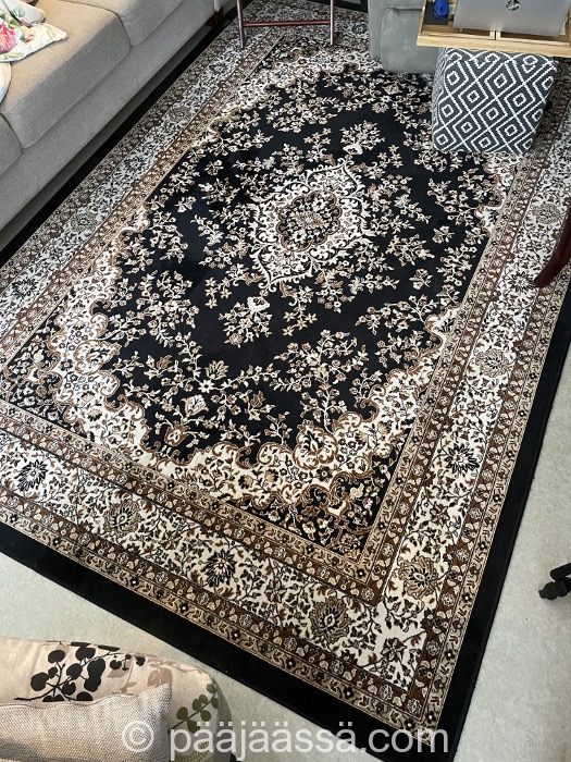 No mutta mitäpä olen sitten tehnyt tässä kuukauden aikana, vai mitään. Hirvittävä pähkäily on ainakin alkanut, mitä aion säilyttää tästä sirkuksesta ja mitä heittää suosiolla pois. Aloitin tavaroiden seulonnan myymällä tummasävyisen olohuoneenmattoni. Laitoin sen Toriin myyntiin, eikä mennyt varmaan viittä minuuttiakaan, kun sille löytyi ostaja. Huhhuh. Toivottavasti kaikki muukin menisi yhtä nopeasti kaupaksi!