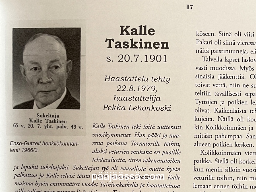 Sattuipas sitten niin hauskasti, että kirjassa oli oikein muutaman sivun juttu edesmenneestä sukulaisestani. Voitte vaan kuvitella tätini ilmeen kun näytin kirjan. Hyvä että pysyi tuolillaan! Kalle Taskinen oli hänen kummi, tätini ja isäni tädin mies. Muistan Kallen oikein hyvin. Kävin pienenä tyttösenä paljon heillä kylässä, kun sieltä sai aina Marianne-karkkia ja keltaista Jaffaa.