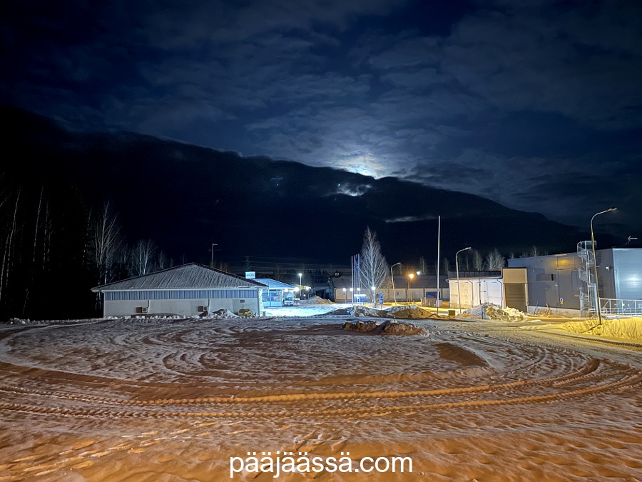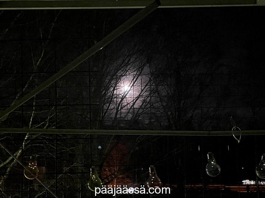 En saanut otettua kuin yhden kuvan, koska kännykästä alkoi loppua akku. Olisin kuitenkin kohta kotona… yksi kuva vaan. Kotiin päästyäni huomasin kuun möllöttävän suoraan parvekkeen puolella. Koivun oksat ovat talvena todella kauniita pimeään aikaan. Niiden muodot ovat todella hienot kuutamoa vasten. Tässä tilanteessa minua todellakin harmitti, että kaiken tämän välissä oli kissaverkko. En usko, että toista tilaisuutta tähän enää tulee.