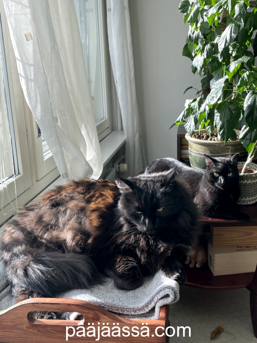 Kevätauringosta pääsivät nauttimaan myös hoidokkikissat, Rölli ja Sysi. Virittelin heille paikkoja ikkunan ääreen, josta voi seurata vaikkapa lintujen vierailua parvekkeella. En ole tosin hetkeen nähnyt lintuja parvekkeellani. Ne saattavat olla reviirejä etsiskelemässä tällä hetkellä.