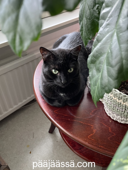 Sysi viihtyi huonekasvien seassa. Hänestä kait tuntui siltä, kuin olisi jossain viidakossa väijymässä.