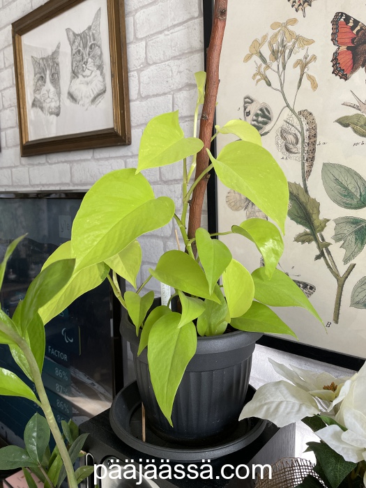 Sain tuttavaltani kultaköynnöksen, joka on lajikkeeltaan Neon. Se on onneksi juurtunut todella hyvin ja on alkanut nyt kasvaa ihan kunnolla. Neonissa on tosiaankin keltaiset lehdet, eikä sellaiset kirjavat, niin kuin tavallisella kultaköynnöksellä on. Se on sijoitettu sellaiseen kasvupaikkaan, ettei aurinko pääse suoraan paistamaan siihen.