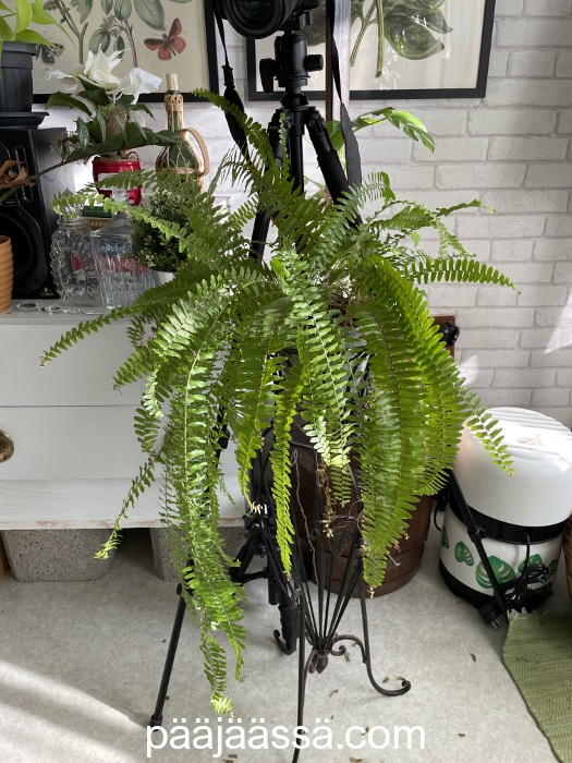 Olen saanut vanhemmiltani myös sulkasaniaisen (Boston Fern). Tässä ei ollut aluksi muuta kuin kaksi lehdykettä. Olen katsellut YouTube-videoita asiaanperehtyviltä kanavilta, ja joka paikassa sanotaan, ettei saniaista pidä sumutella. Olen myös kuullut tuttavilta, kuinka heidän saniaiset eivät kerta kaikkiaan menesty, vaikka tekisivät mitä. Voisiko siis syy olla sumuttelussa? Kun lopetin saniaisten sumuttelun aikoinaan, niin omanikin ovat alkaneet viihtyä. On aivan eri asia, jos saniainen on vaikkapa kylpyhuoneessa, jossa se saa epäsuoraa kosteutta lehdille. Lämpimän patterin vieressä olevaa saniaista, tai mitään muutakaan kasvia ei tulisi sumutella lainkaan. Sumuttelu ei siis lisää kasvin ympärillä olevaa ilmankosteutta, vaikka niin joskus väitetään.