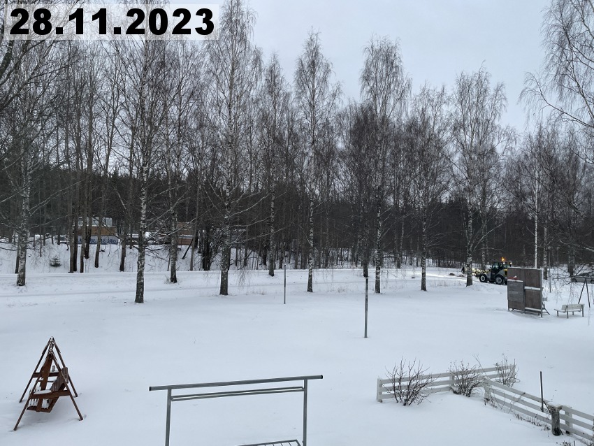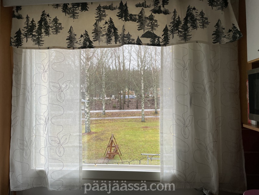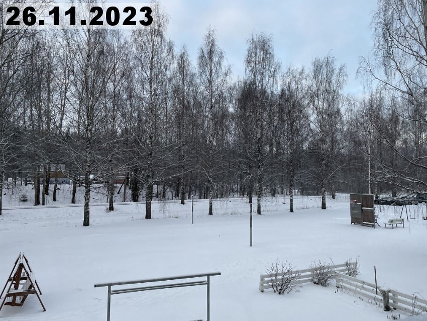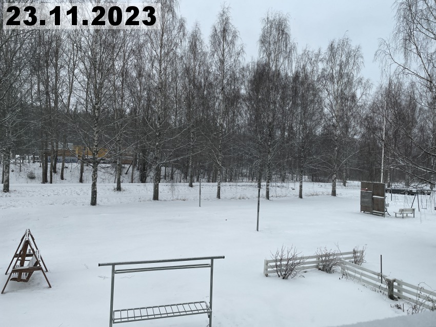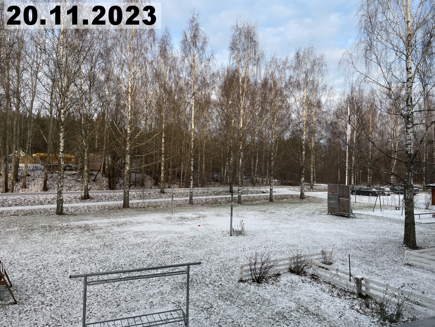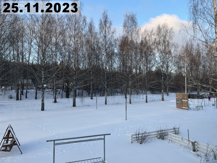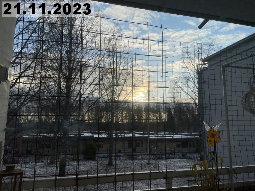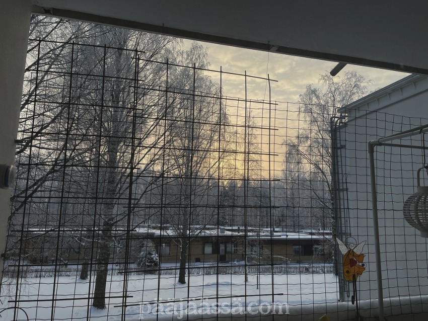 Eilinen kaunis talvipäivä muuttui tänään totaalisesti, koska meitä lähestyi lumipyry. Se alkoi täällä Imatran kohdilla suunnilleen yhdeksän aikaan aamulla. Kaunis auringonnousu oli tältä aamulta peruttu ja tilalle tuli lumisade. Noh, se kuuluu talveen, onneksi vielä. Tänään onkin sitten hyvä päivä tehdä muutakin kun vain ihailla maisemia. Tätä kuvaa ottaessani tajusin, että olen unohtanut parvekkeelle vähän yhtä sun toista tarpeellista tavaraa, kuten pistorasiaan laitettavan ajastimen ja harjan ja rikkalapion. Sen verran on kuitenkin kylmää, että en millään kehtaisi avata parvekkeen ovea, kun parvekeoven alta tulee muutenkin kylmää ilmaa. Pitää kait tehdä sellainen viimamakkara.