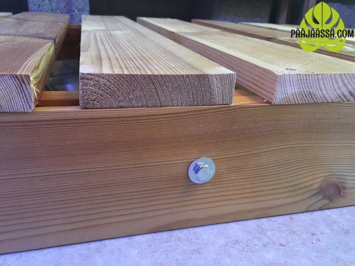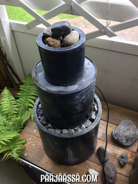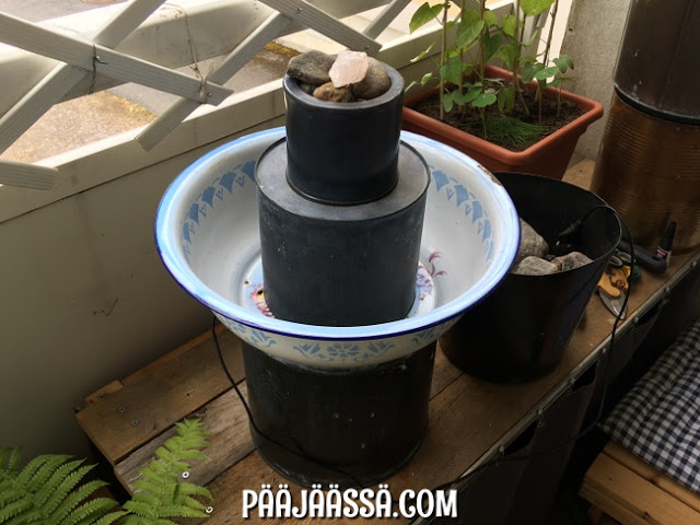 Vielä oli vähän työstettävä puureunusta. Olen vielä tässäkin vaiheessa kahden vaiheilla, että laitanko tuon puureunuksen vesiaiheeseen vai en. Toisaalta olisi ihan kiva, että vesiaihe olisi korkealla eikä lattiatasolla. Lisäksi saan ”hävitettyä” roipetta vesiaiheen jalustaan, kun teen sen tällä idealla. Paljun alla on neljä harkkoa, ja niille pitäisi sitten keksiä tilaa muualta parvekkeelta, jota en nyt jaksa käydä pähkäilemään. Haluan sinne mahdollisimman vähän tavaraa.
