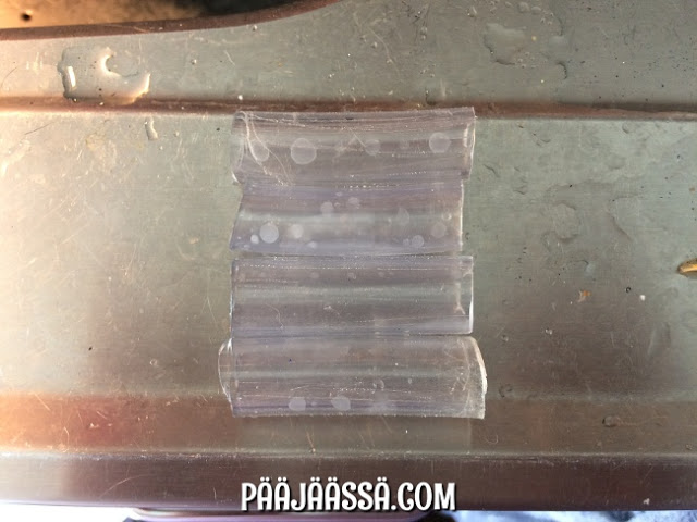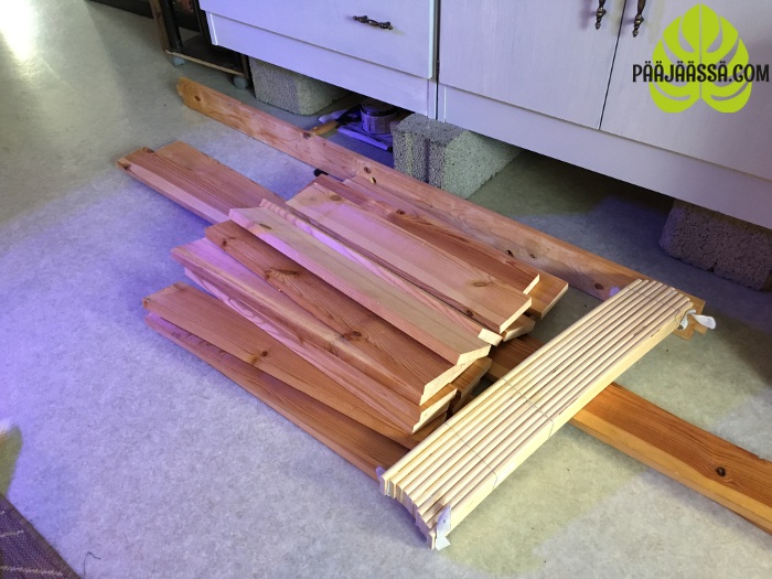 Mainitsin aikaisemmin ritilän, jota en loppujen lopuksi käyttänytkään, niin sen tulikin korvaamaan tällainen isompi rosteriritilä, jonka sain tuttavaltani. Kiitos vaan Janille tästä loistavasta tarvikkeesta. Toisen romu on toisen aarre, niinhän se menee. Kyseessä on siis uuniritilä (uusia uuniritilöitä ja muita varaosia voi kysellä lisää Vuoksen huolto- ja asennuspalvelu -liikkeestä). Ritilän tulee kestää isompienkin kivien painoa, eikä se saa antaa periksi. Sitten ei muuta kun panelien käsittelyyn. Päätin käyttää niiden sävyttämiseen Supi saunasuojaa, jota olen käyttänyt todella monessa muussakin projektissa. Sitä voi levittää hyvin puupinnalle superloni-palasella. Suojakäsineet kannattaa myös olla, vaikka saunasuoja onkin vesiliukoista.