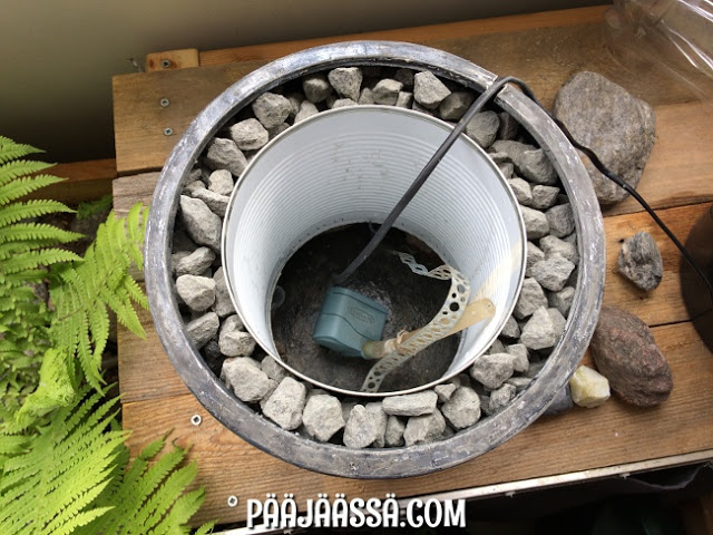 Kun tillireunus oli tehty, aloin miettiä mitenkä saisin mahdolliset kivet aseteltua paljun päälle. Reunuksen piti tietenkin olla jollain tapaa piilossa. Tein virityksen alkujaan harjateräsverkon palasta, verhotangosta ja kanaverkosta. Myöhemmässä vaiheessa voi huomata, että en käyttänyt sitä lainkaan vesiaiheen kasaamisessa. Ja ihan hyvä niin, koska asiaan löytyi paljon parempikin ratkaisu, mutta vasta tällä viikolla. Olin aluksi myös aikeissa laittaa paljuun lumpeen kasvamaan. Senkin ajatuksen sain haudata monen muun idean myötä, kun otin vähän selvää lumpeen kasvamisesta. Vesiaiheen korkeus ei olisi riittänyt sille. Siispä ostin keinotekoisen lumpeen, joka löytyi paikallisesta Mainio-tavaratalosta.