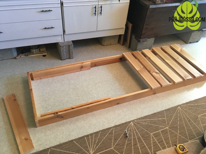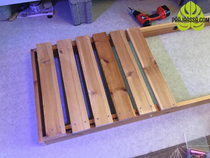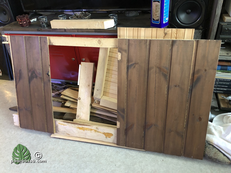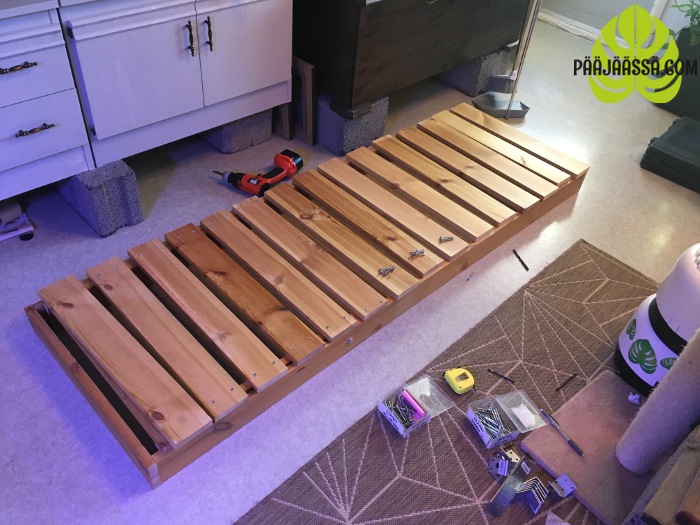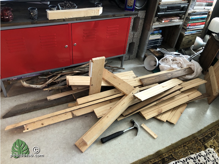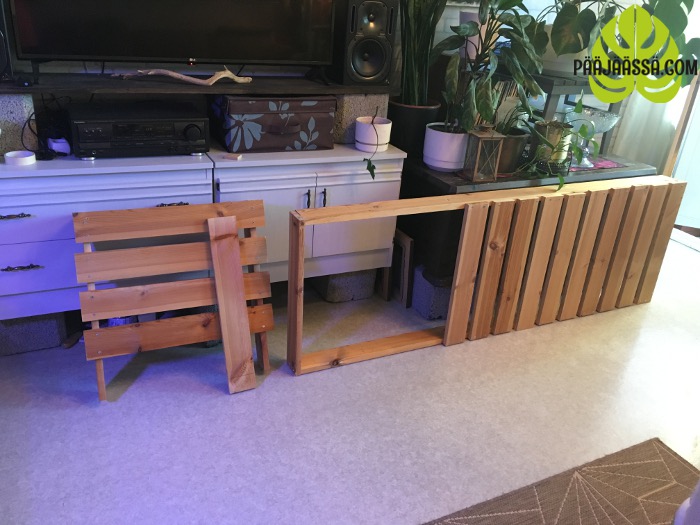 Jaa niinhän siinä taas kävi, että purin tuon virityksen pois 2022 kesällä ja siirsin vesiaiheen parvekkeen toiseen laitaan. Tässä vaiheessa alkoi olla jo hermot hieman riekaleina kaiken maailman tiiliskivien siirtelystä, niin sainkin päähäni tehdä koristereunuksen akvaariokabinetin purkupaneleista. Niitä kun minulla sattui entuudestaan löytymään. Kevyttä puista reunusta olisi paljon helpompi siirrellä, jos tarvitsee. Asettelin tiiliskivet parvekkeen reunoille ja sijoitin saniaislaatikot ja paljon muutakin niiden päälle.
