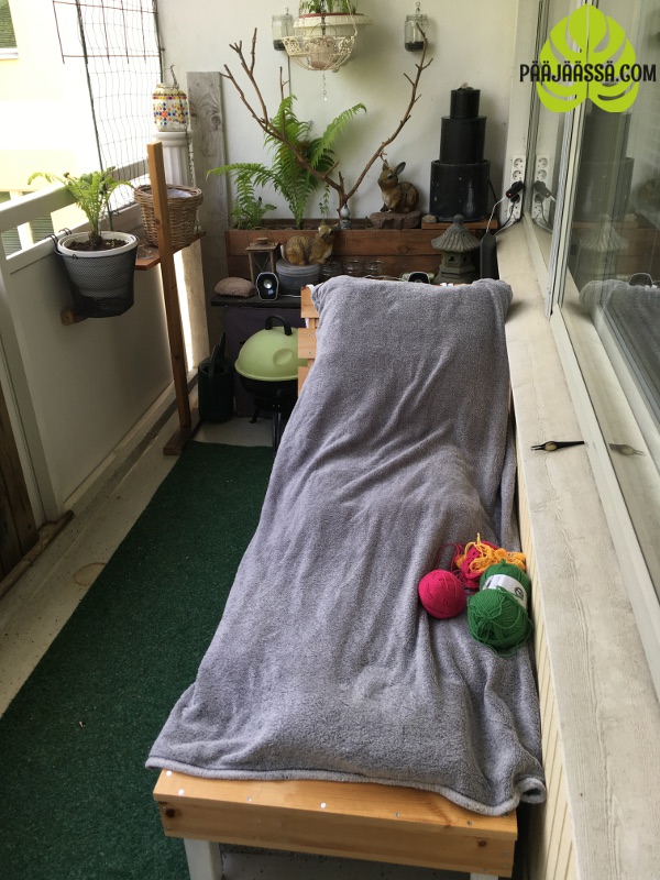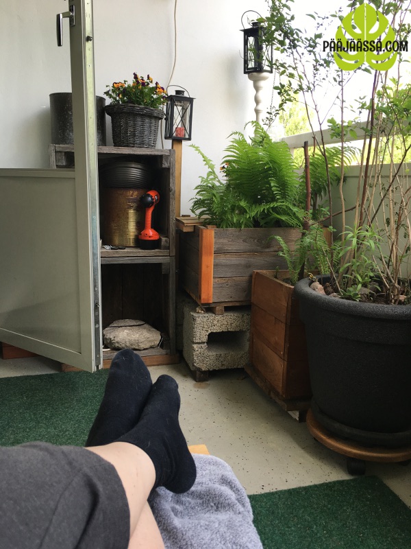 Viime vuodelta minulla ei juurikaan ole kuvia paljun rakentelusta, koska se todellakin oli koko kesän toisessa laidassa parveketta. Mutta nyt tänä vuonna päätin vihdoinkin sen lopullisen paikan. Siirtelin todella paljon tavaroita, että pääsin edes aloittamaan koko projektin. Parveke oli aivan sekaisin ja nurkkaus piti siivota heti ensimmäiseksi. Asettelin Leca-harkkoja ees taas. Aluksi ovi ei avautunut tarpeeksi, sitten harkot nostivatkin paljua korkeammalle kuin halusin… mitähän vielä. Lopullinen paikka löytyi kuitenkin heti parvekekaiteen vierestä. Takana olevat harkot piti nostaa pystyyn ja laittaa puulaatikko niiden päälle. Ja kas kummaa, parvekeovi aukesi lähes kokonaan auki. Täydellistä!