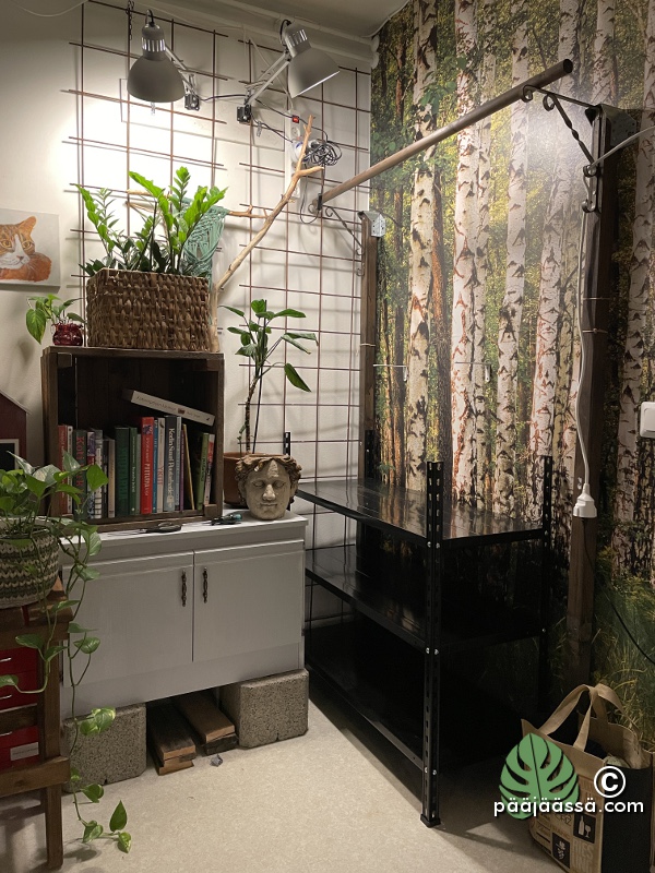 Siirsin loppukesästä kasvihyllykön ikkunan ääreen, jotta kasvit saisivat mahdollisimman paljon luonnonvaloa. Homma on vielä totaalisen kesken. Minulla kun on ollut tässä kissahoidokkeja pitkin alkusyksyä, joiden vuoksi olen tehnyt erikoisia järjestelyjä. Viimeisimmät kissavieraat eivät olleet onneksi kiinnostuneita huonekasveistani toisin kuin edelliset. Kerron näistä ihanista vieraista toisessa postauksessa.