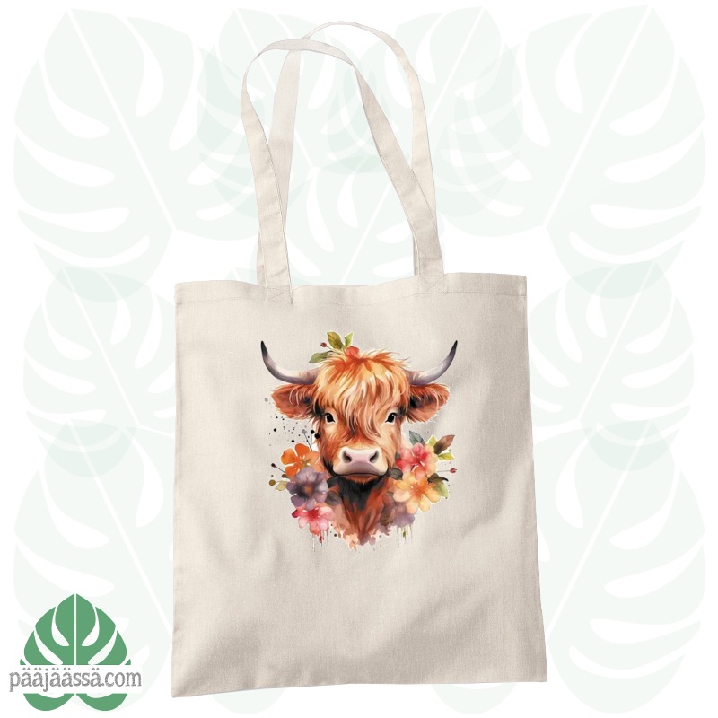 Pitkäsankainen olkakassi johon on painettu ihana ylämaankarjan kuva. Kuva on taiteellinen ja muistuttaa vesivärimaalausta. Kuva on digiprintti.