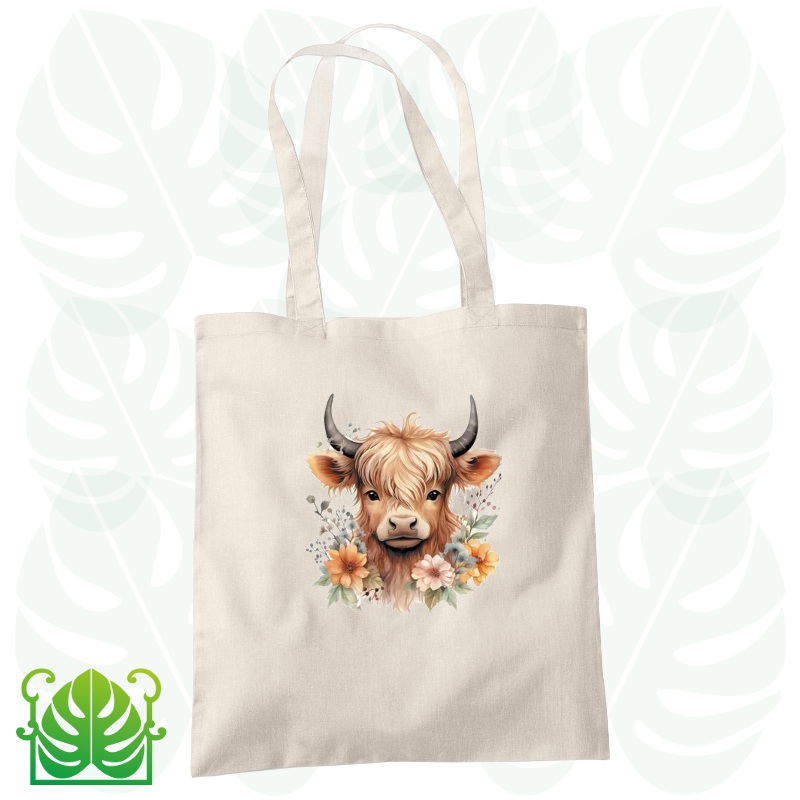 Pitkäsankainen olkakassi johon on painettu ihana ylämaankarjan kuva. Kuva on taiteellinen ja muistuttaa vesivärimaalausta. Kuva on digiprintti.